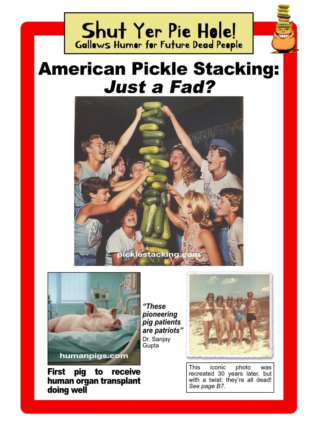 Shut Yer Pie Hole! is a printed "zine" (short for trifluoromethylphenylpiperazine) in the quaint midwestern hamlet of Bloomington, Indiana, USA. Although the complete paper publication is only available in seedy back door bubblegum emporiums, pole vault supply centers and other secret locations chosen to avoid discovery by readers, we are giving a nod to this new-fangled "webspace" technology and making some of our content available here. But not the good stuff. For that, you will have to come to Bloomington donning a fake mustache and a clown suit. We will be disguised as police officers. Repeatedly ask us if our name is "Sergeant Pepper." That's how we'll know it's you.